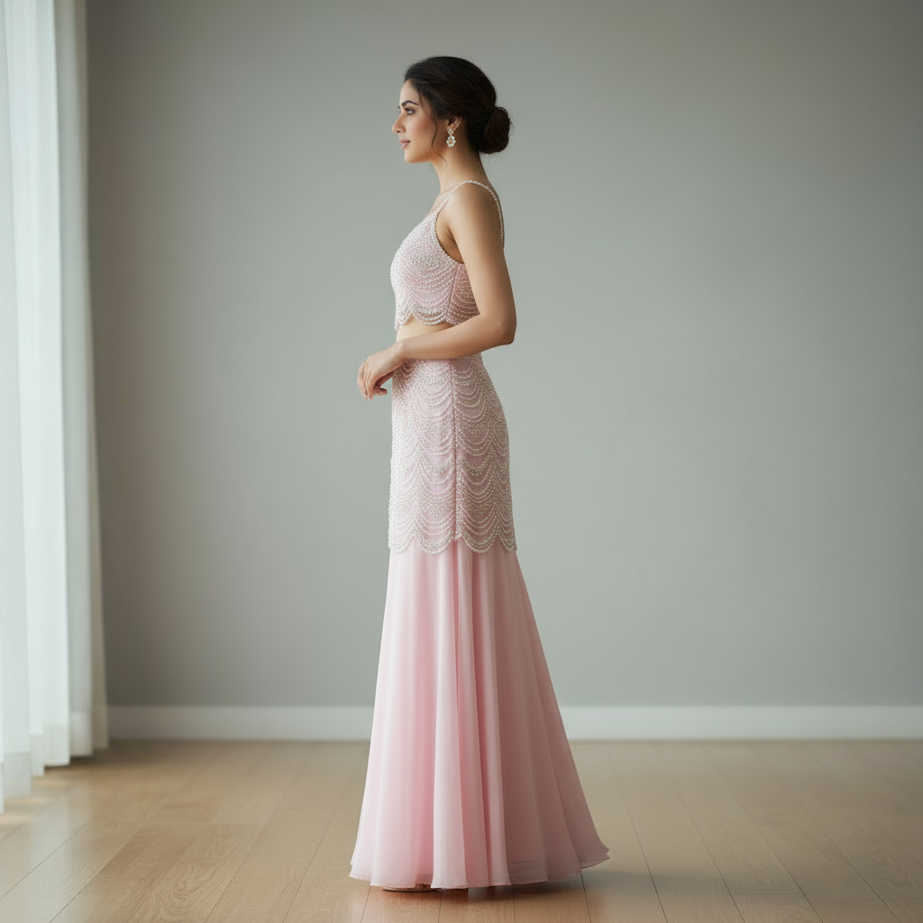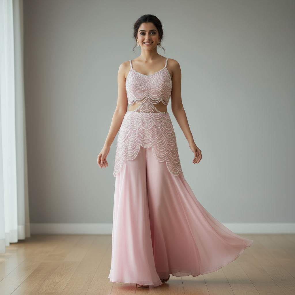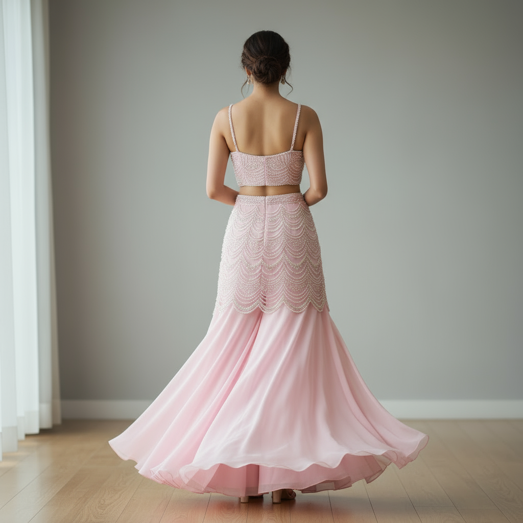 A graceful pastel pink ensemble featuring a heavily embellished scallop-pattern crop top paired with a flowy layered skirt. Designed for elegance and comfort, this outfit is perfect for festive occasions, weddings, and celebrations. The scalloped beadwork adds texture and sophistication, while the soft flared silhouette gives a dreamy, feminine charm.