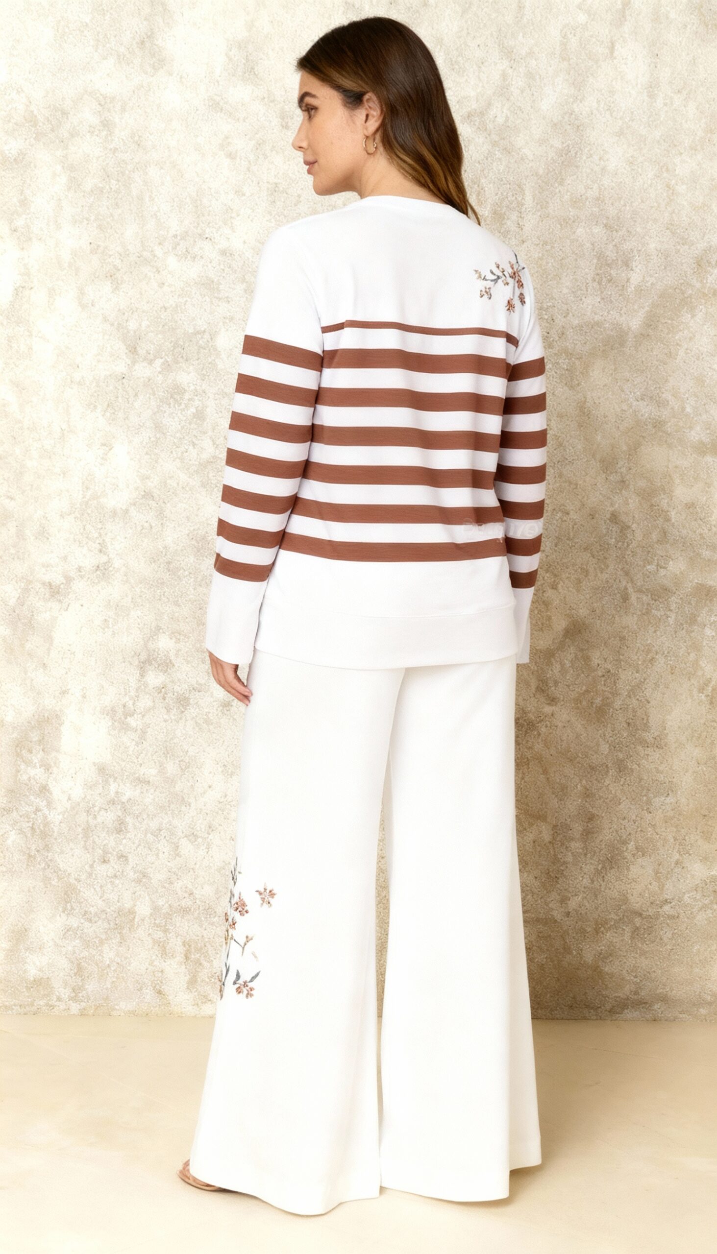 A chic and comfortable lounge-wear co-ord set featuring a brown-and-white striped top adorned with delicate floral embroidery on the shoulder. Paired with wide-leg white pants embellished with matching floral motifs, this outfit is perfect for casual, relaxed, and everyday wear.