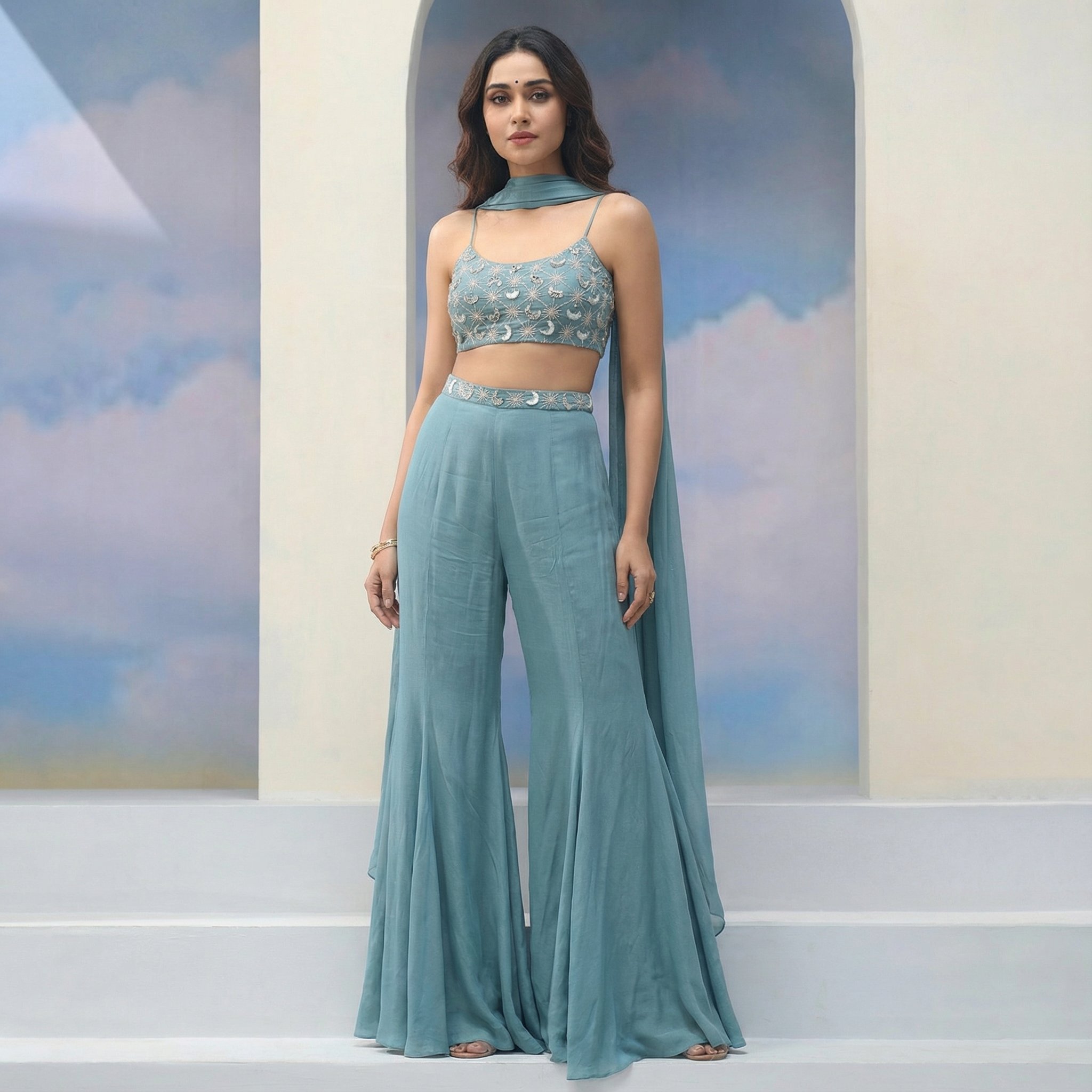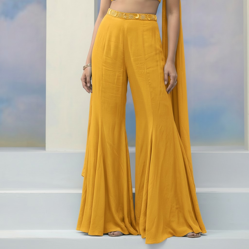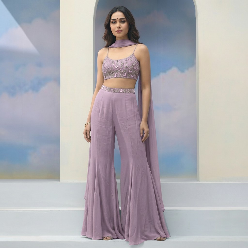 Radiate effortless elegance with this embroidered crop top and palazzo set, crafted for contemporary festive dressing with a refined ethnic touch. This three-piece ensemble strikes the perfect balance between comfort and statement style. The sleeveless crop top features delicate tonal embroidery, adding texture and artisanal charm to the look. Designed with slim shoulder straps and a flattering cropped length, it beautifully complements the fluid silhouette of the palazzo pants. The high-waisted palazzo offers a relaxed yet graceful fall, ensuring ease of movement and all-day comfort. Completing the ensemble is a soft matching dupatta, styled elegantly around the neck to elevate the overall look. The lightweight, breathable fabric enhances the outfit’s flowy appeal, making it ideal for long celebrations. Perfect for festive occasions, mehndi functions, haldi ceremonies, daytime weddings, and celebratory gatherings, this set is a versatile addition to your ethnic fusion wardrobe.
