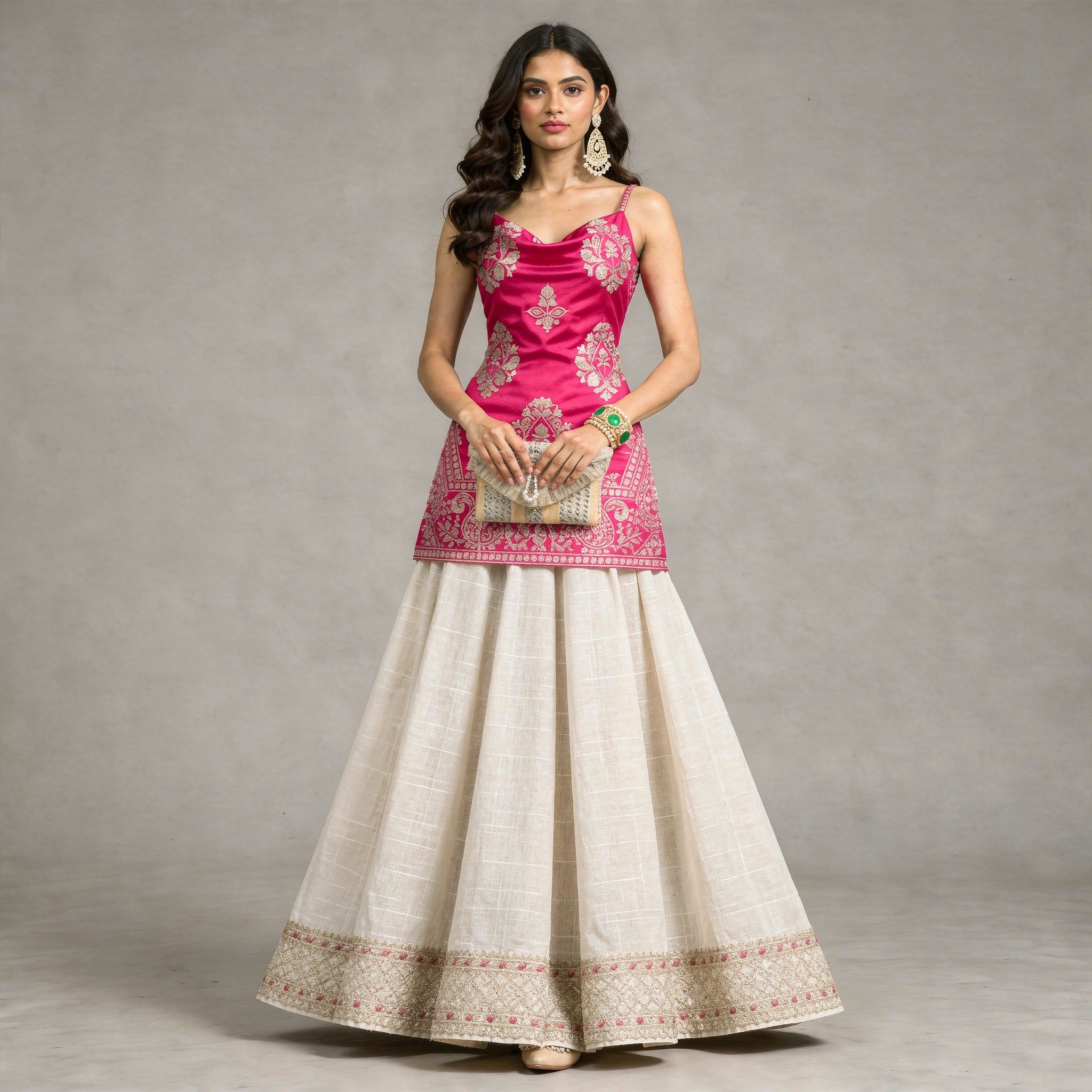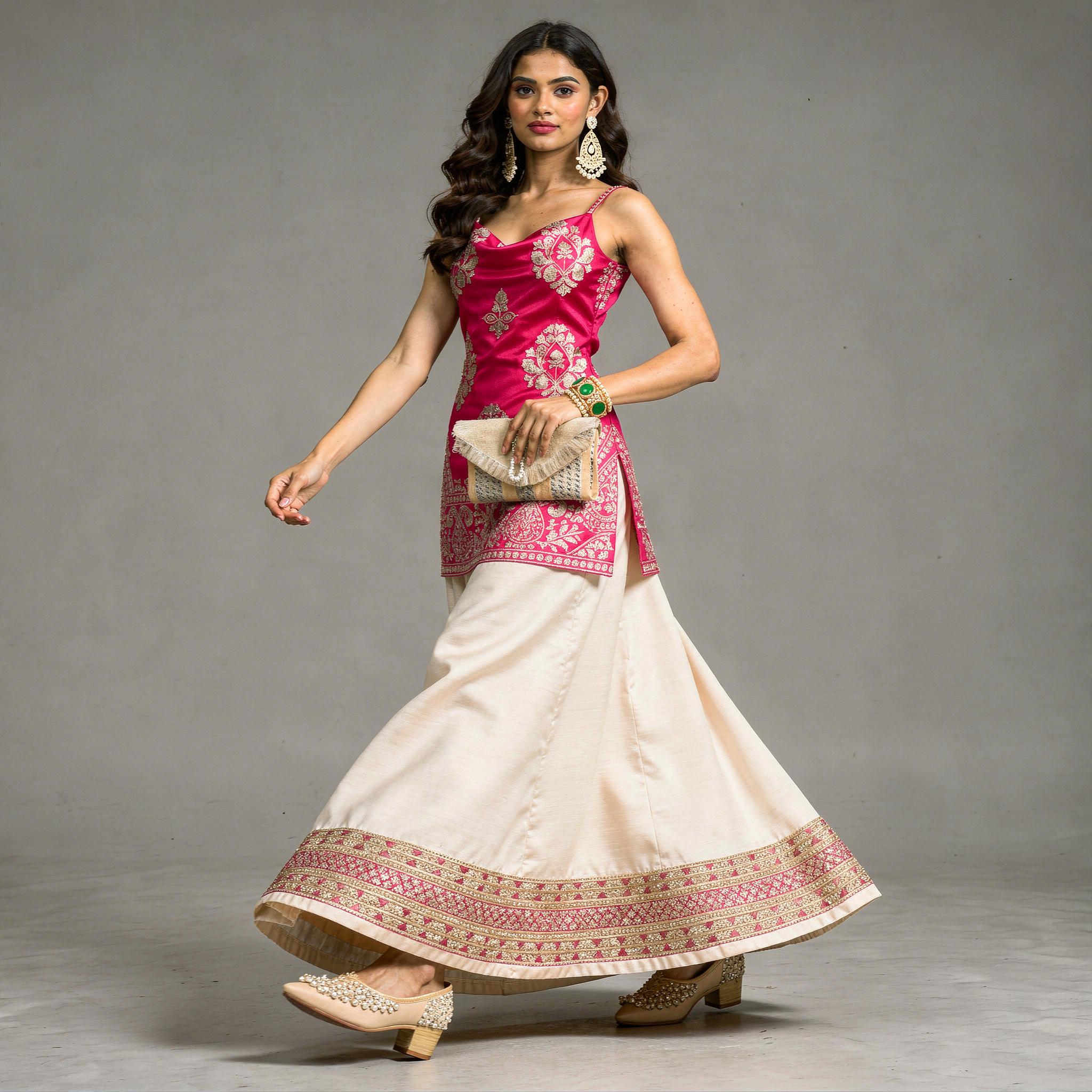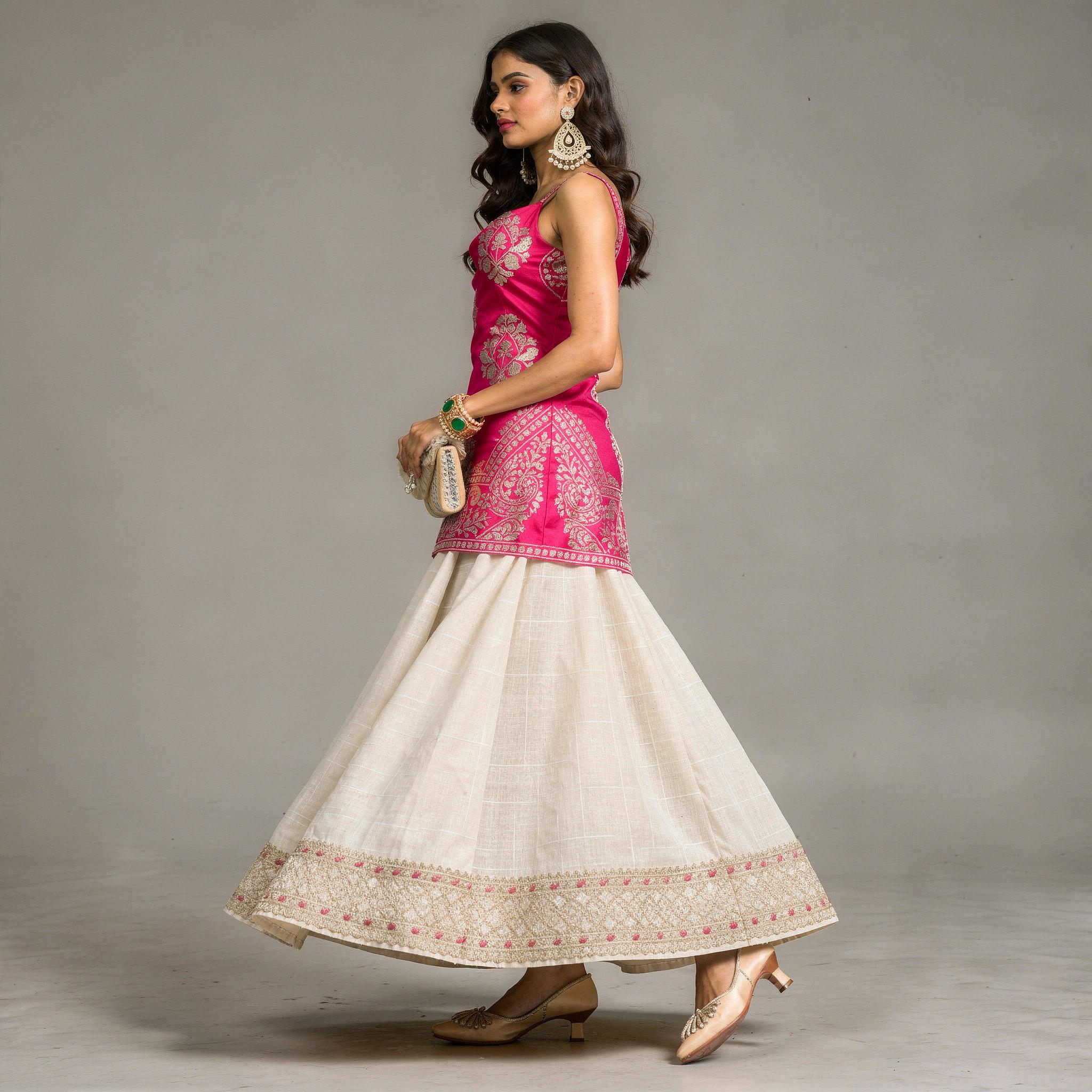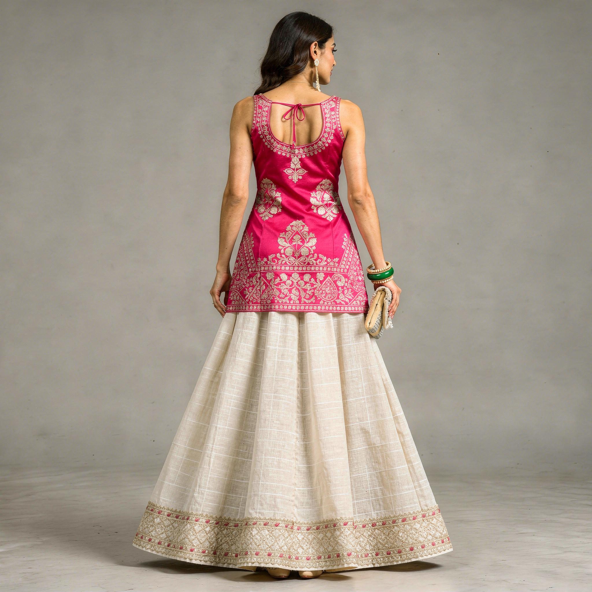 Make a striking festive statement with this fuchsia and ivory lehenga ensemble, crafted for women who love contemporary elegance with a traditional touch. The fitted satin blouse is highlighted with intricate gold motif detailing, adding a rich and regal charm. Paired with a beautifully flared ivory skirt featuring an ornate embroidered border, this look creates a graceful silhouette perfect for weddings and grand celebrations. Designed to stand out with sophistication, this outfit is the ideal choice for receptions, festive evenings, and special occasions.