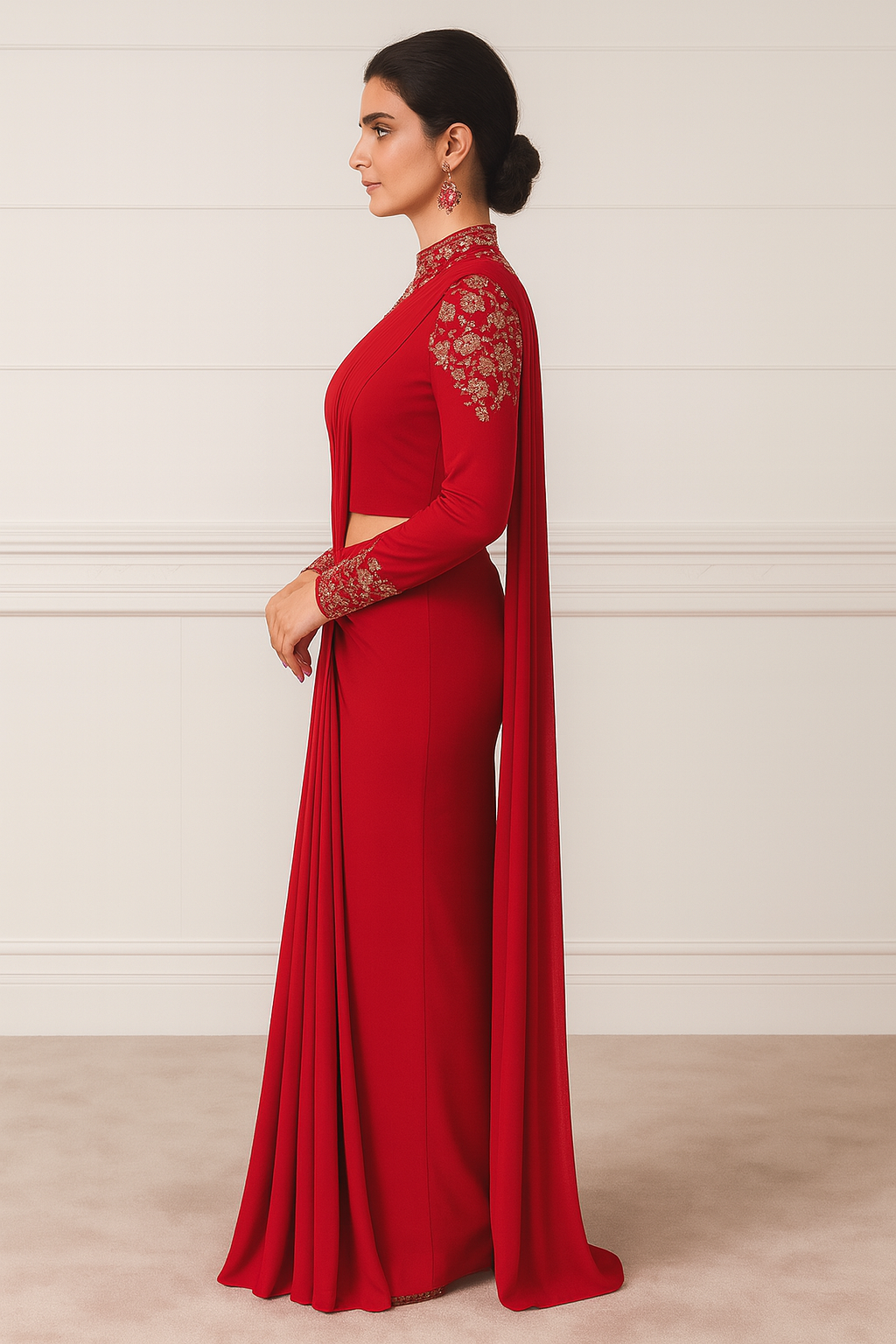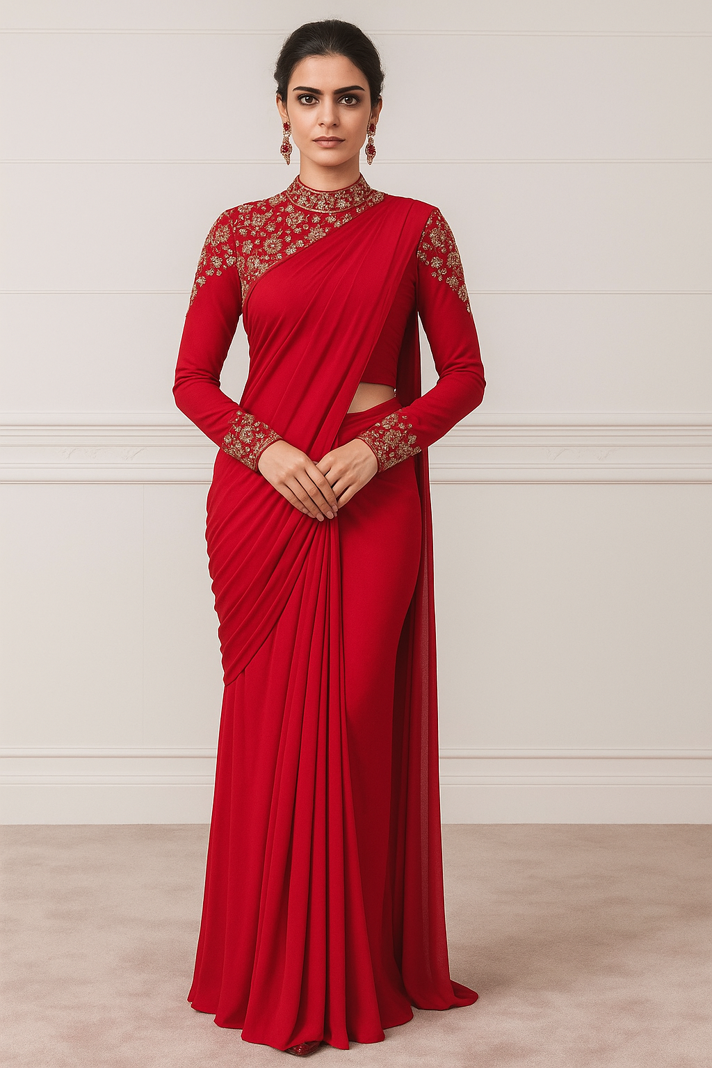 Step into elegance with this striking red pre-stitched designer saree, offering a modern twist to traditional attire. This ensemble is crafted to combine convenience and sophistication, making it the ideal choice for festive occasions, receptions, weddings, and formal celebrations. The attached blouse showcases intricate gold floral embroidery on the neckline, sleeves, and shoulders, exuding a regal charm while emphasizing the tailored fit. Styled elegantly with statement earrings, this saree creates a harmonious balance between modern aesthetics and timeless tradition.