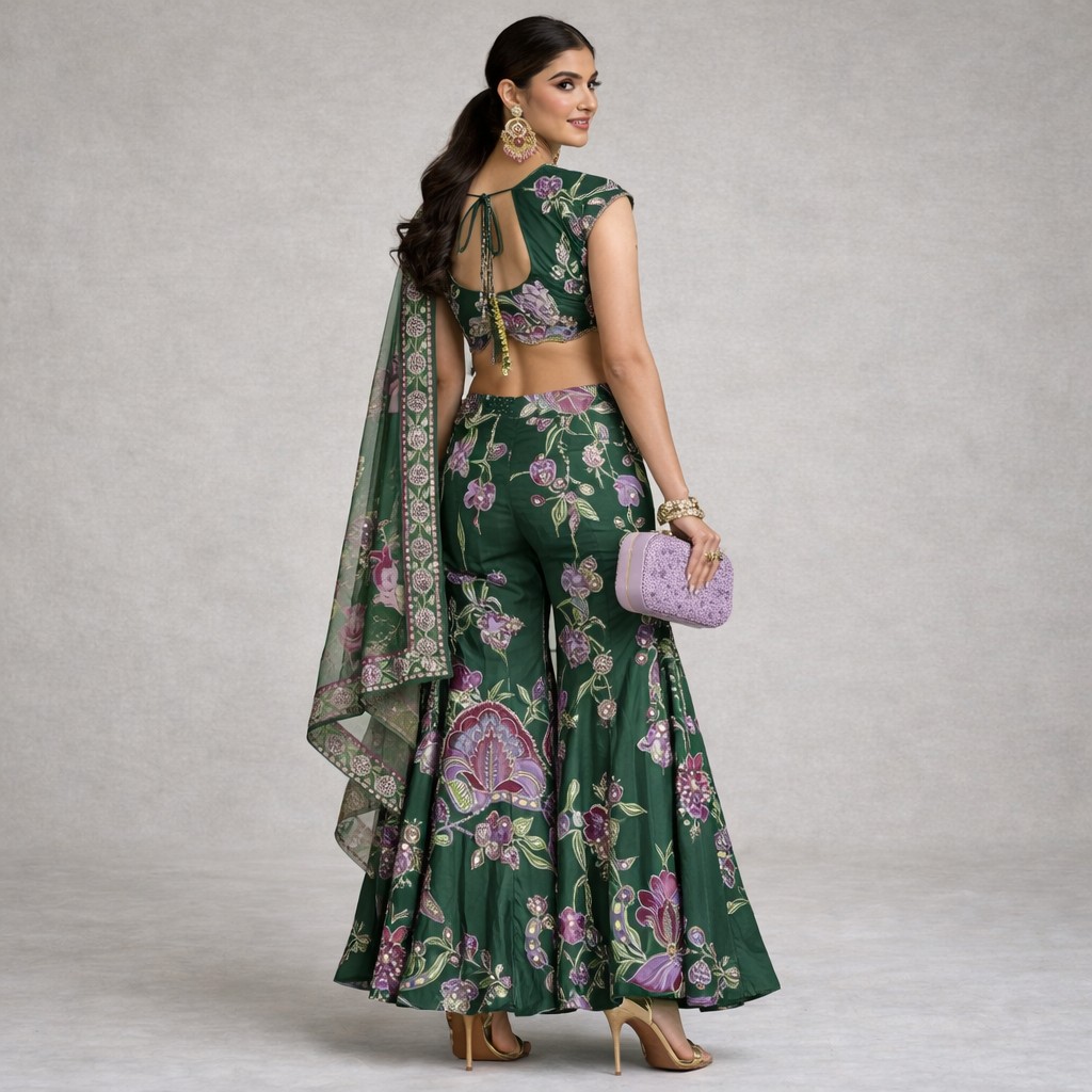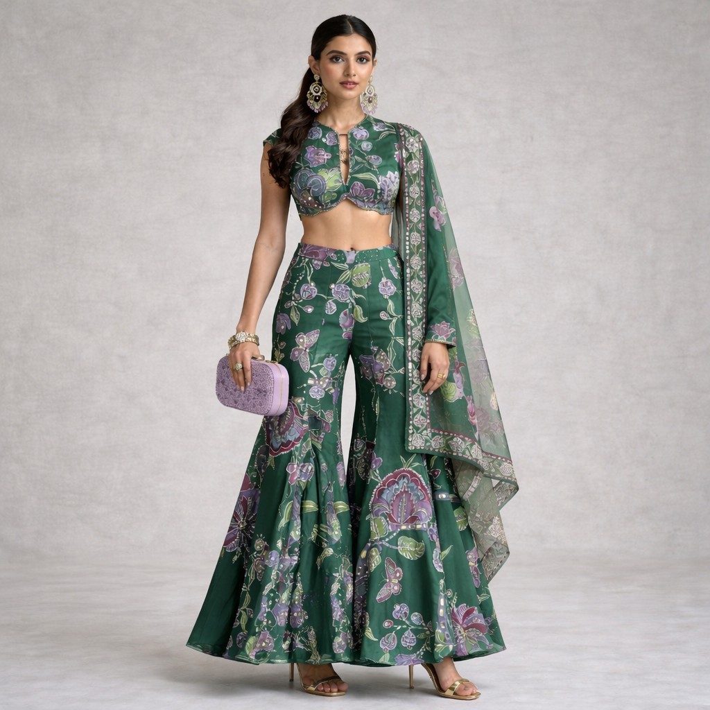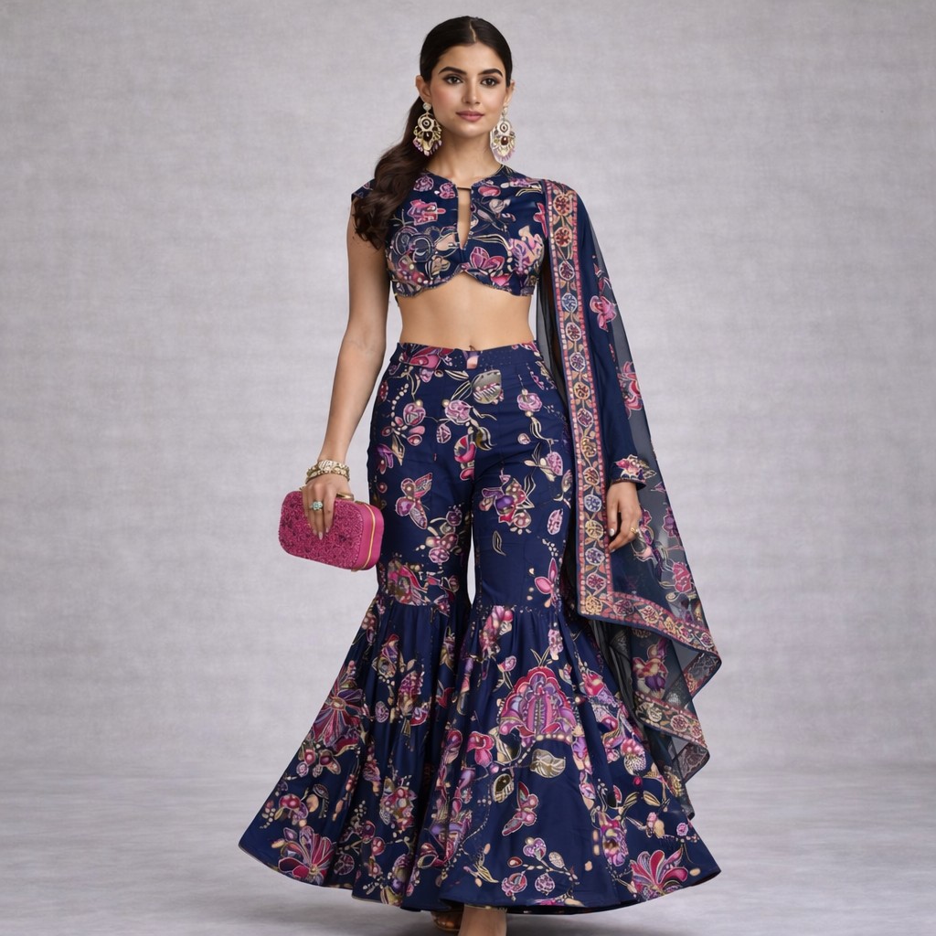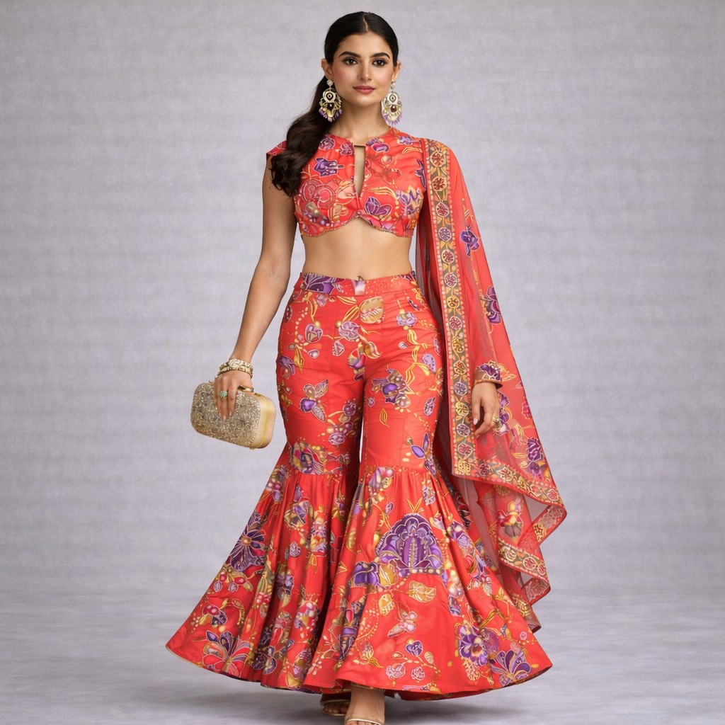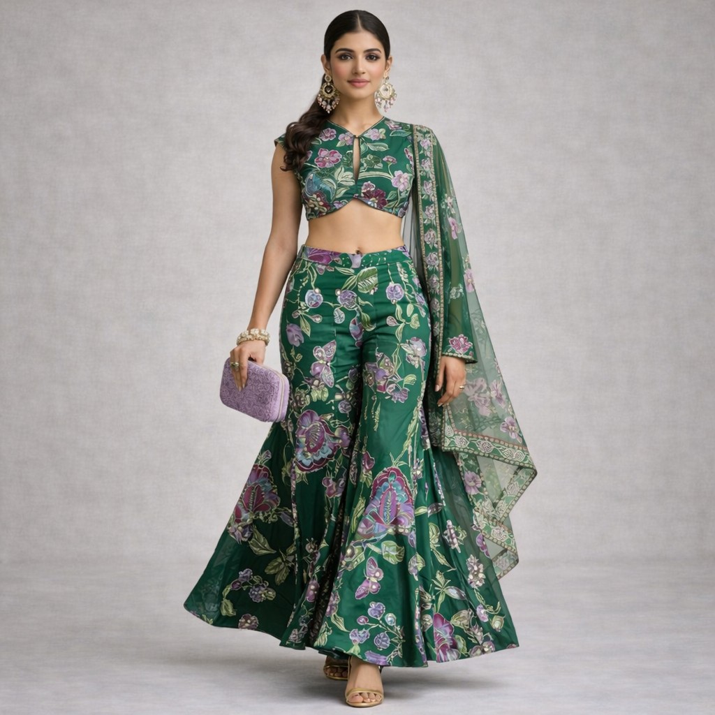 - Set Includes: Printed crop blouse, flared sharara pants, and matching dupatta