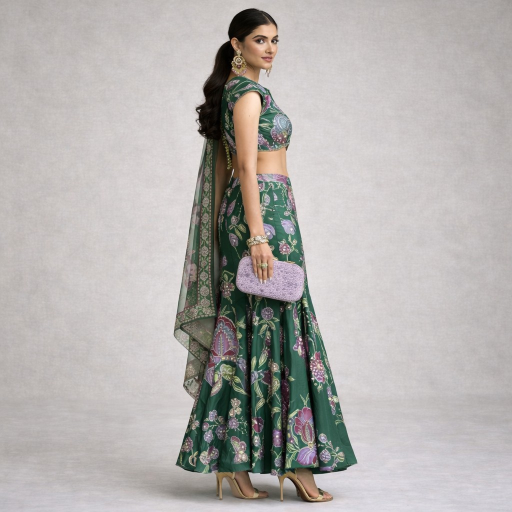 - Product Details: Deep emerald green sharara set with all-over floral print, paired with a structured blouse and coordinated dupatta