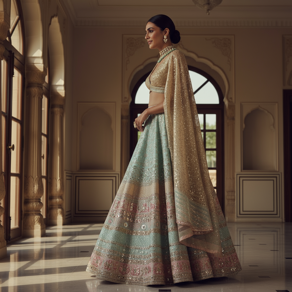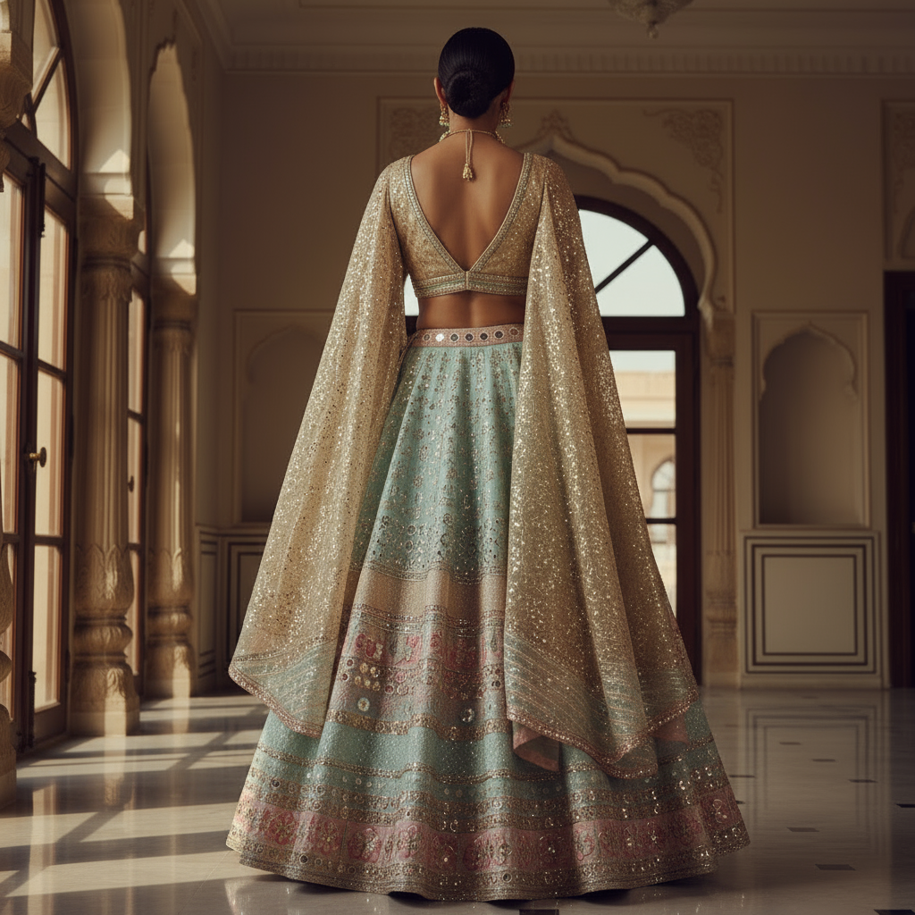 Experience the perfect harmony of tradition and contemporary fashion with our exquisite pastel blue lehenga set. Designed to turn heads, this ensemble is tailored for those who cherish artistic craftsmanship while embracing modern silhouettes. The pastel blue skirt, adorned with detailed embroidery and dazzling mirror work in shades of pink, gold, and silver, creates an understated yet striking vibe. Ideal for weddings, festive soirées, or grand celebrations, this outfit ensures you’ll be the center of attention.