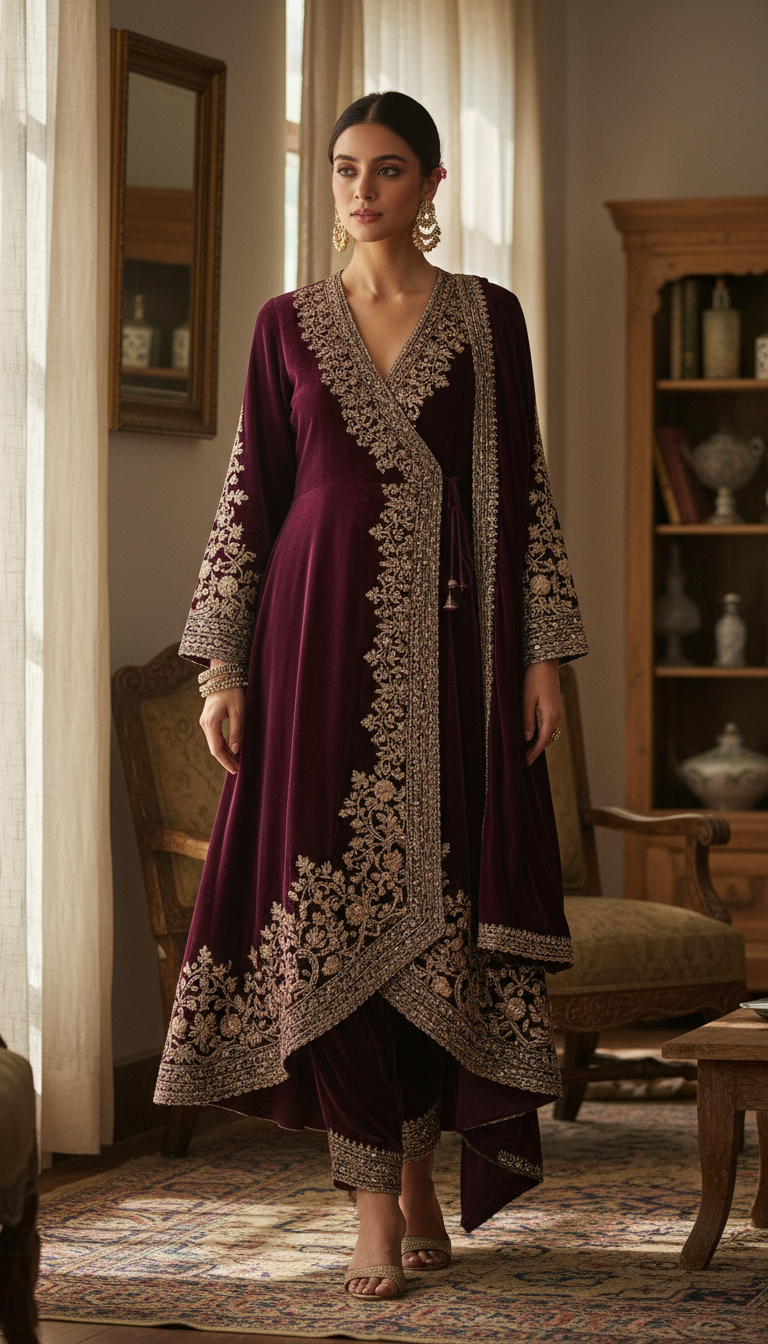 Wrap-Style Anarkali Kurta Set / Embroidered Velvet Ethnic Set