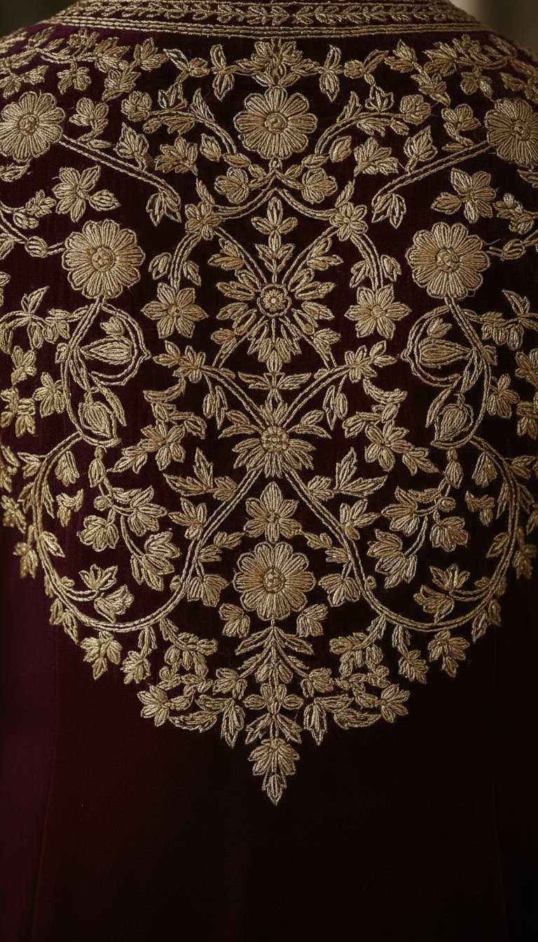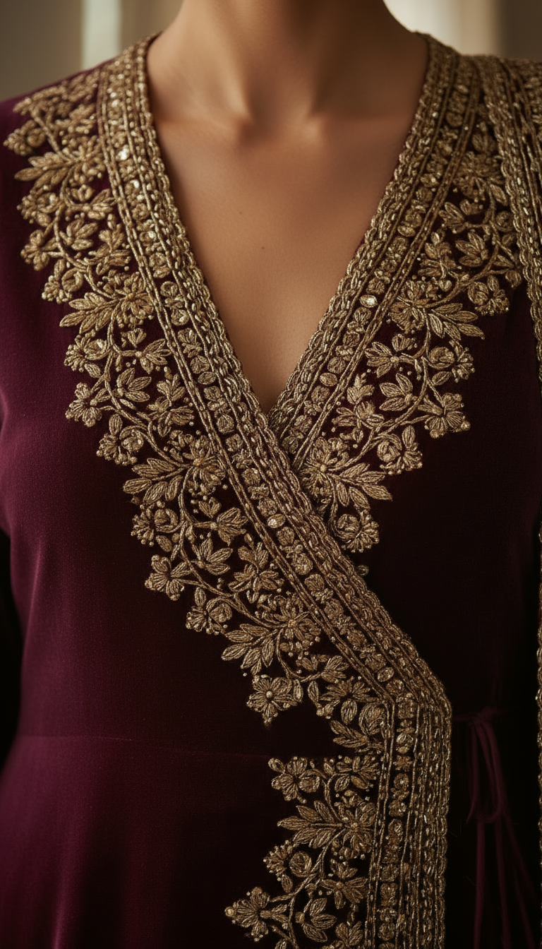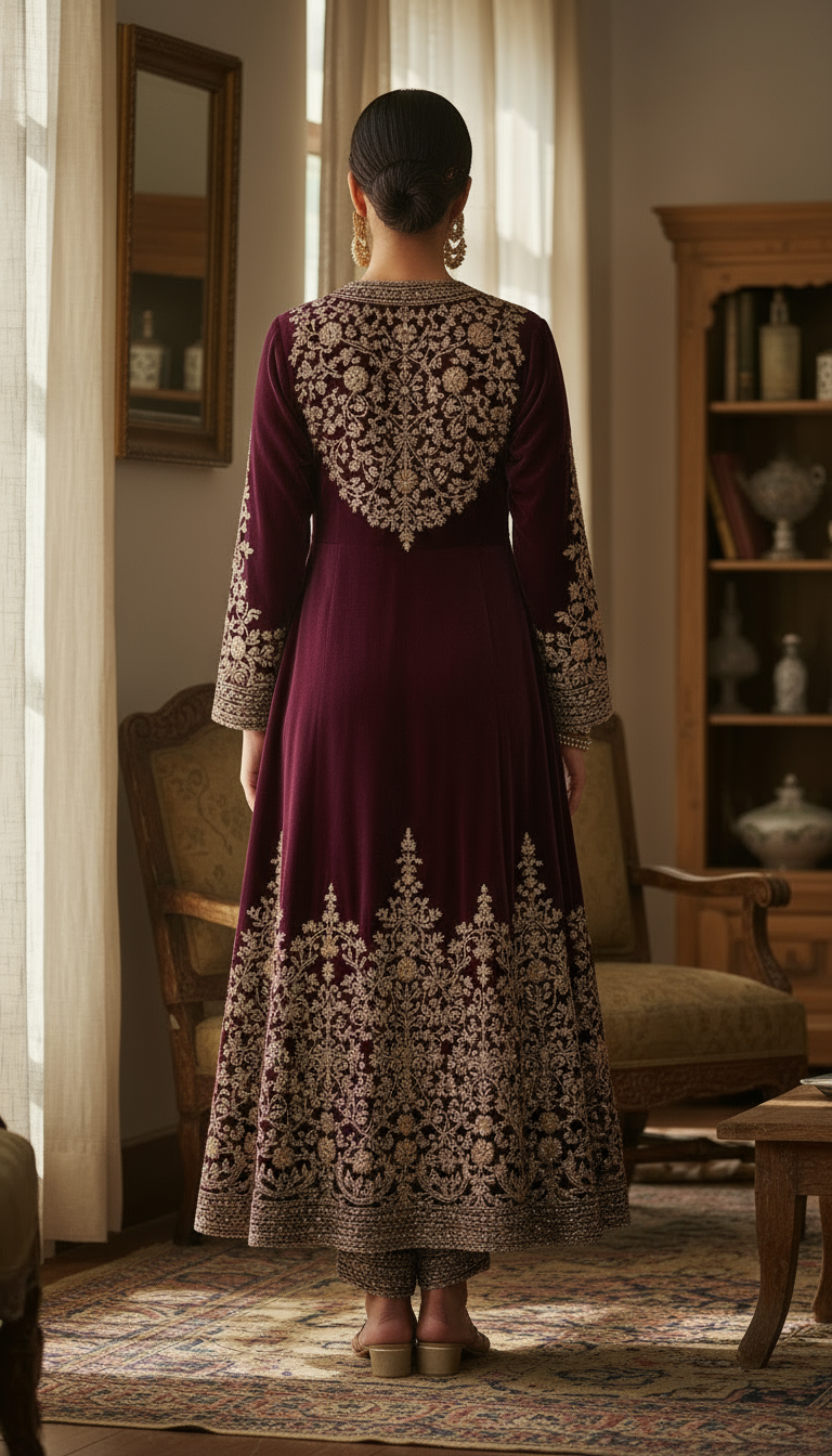 A luxurious plum velvet wrap-style Anarkali set featuring intricate metallic gold thread embroidery inspired by traditional Kashmiri and Mughal florals. The overlapping front panel is richly embellished along the neckline, borders, and hemline, creating a grand, regal look. The sleeves and back carry elaborate floral motifs, adding depth and opulence. Paired with matching embroidered straight pants, this silhouette blends elegance, drama, and sophistication—perfect for premium festive and wedding occasions.