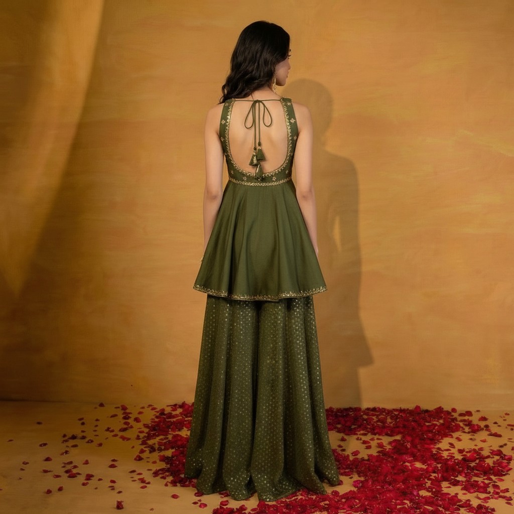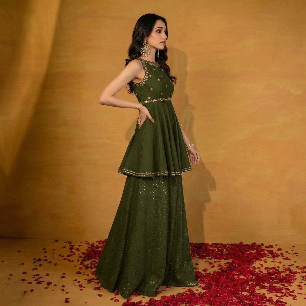 Grace meets contemporary elegance in this peplum kurta and palazzo set, designed for refined festive dressing. The sleeveless peplum-style kurta features delicate all-over printed motifs with a softly defined waistline, creating a flattering and feminine silhouette. The flared hem adds effortless movement and a touch of modern charm. Paired with flowy printed palazzo pants, this ensemble offers comfort without compromising on style. The lightweight fabric drapes beautifully, making it ideal for long celebrations and day-to-evening occasions.