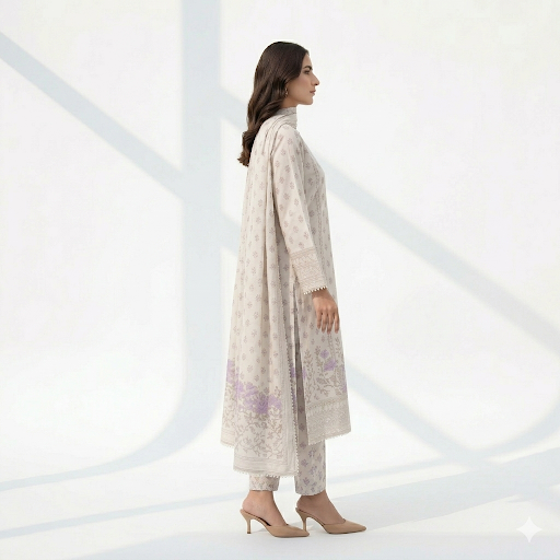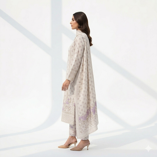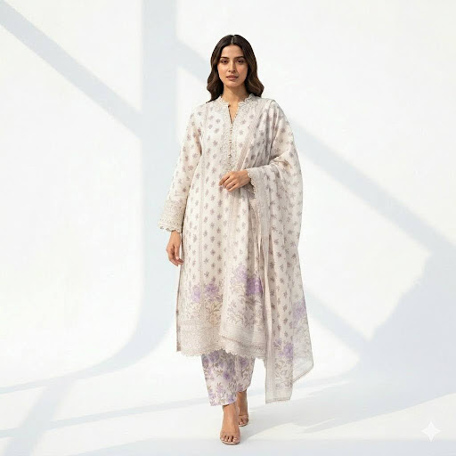 A stunning off-white kurta set with soft lavender floral prints and delicate embroidery — perfect for any occasion, whether it’s Eid, a festival, a family function, or just a regular day out.
