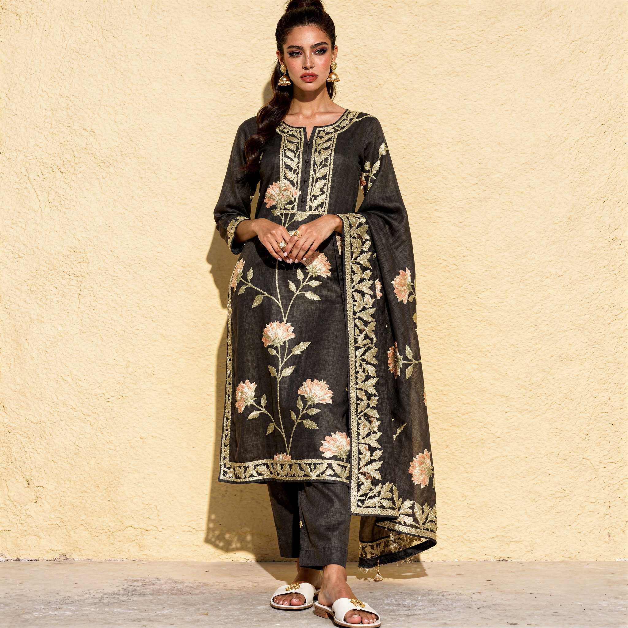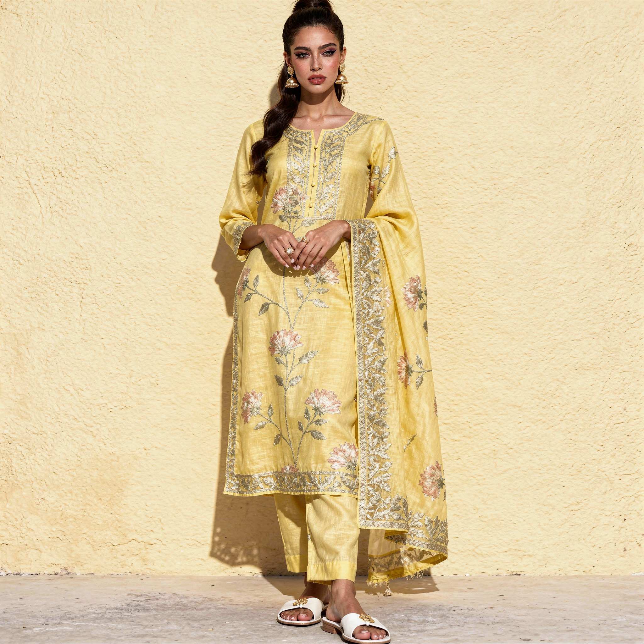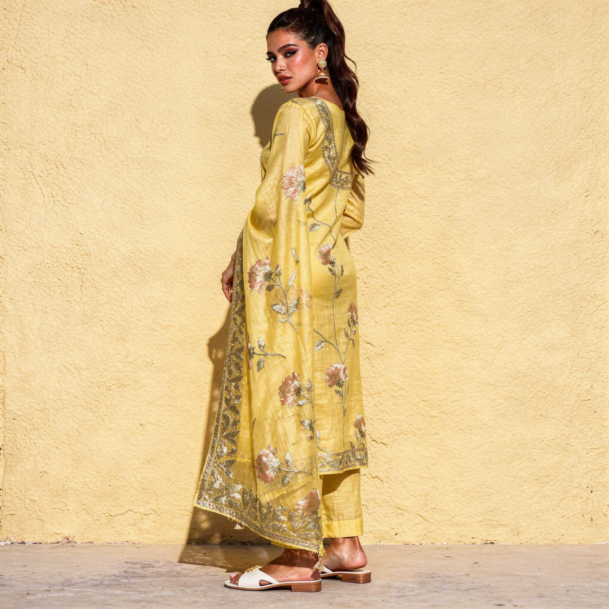 Brighten your festive wardrobe with this sunlit yellow suit set, designed for effortless elegance. The kurta features delicate floral motifs with subtle embroidery accents, paired with straight-fit pants for comfort and ease. Completed with a beautifully bordered dupatta, this ensemble is perfect for daytime celebrations, summer festivities, and graceful ethnic occasions. Fresh, vibrant, and timelessly chic.