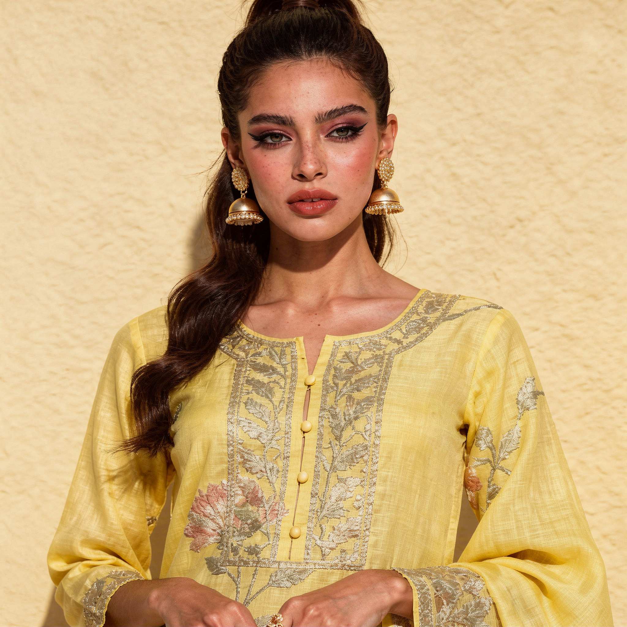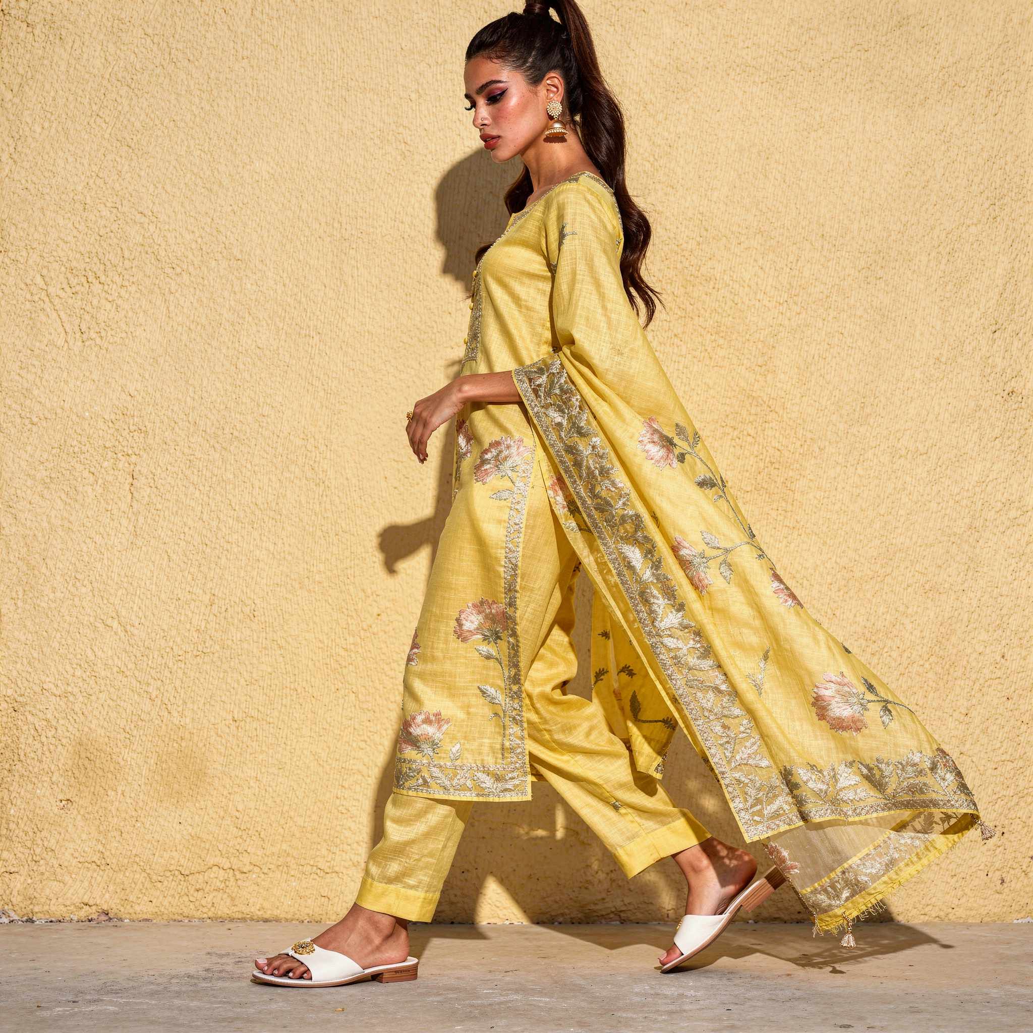 - Product Details: Soft yellow kurta with floral motifs paired with matching trousers and a border-detailed dupatta