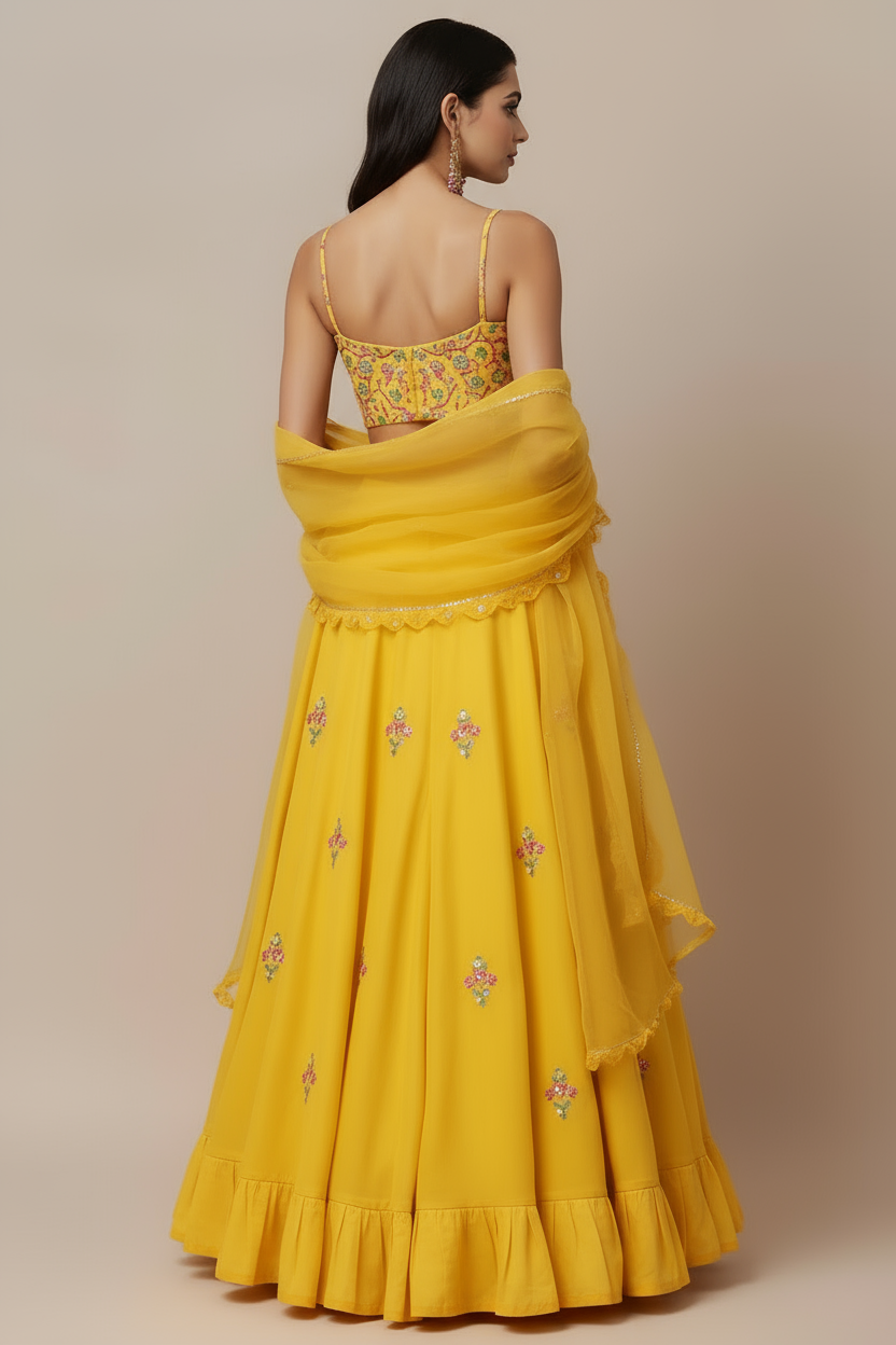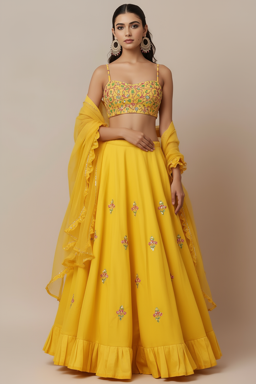 A vibrant yellow lehenga set featuring a delicately embroidered blouse with floral motifs, paired with a flared skirt adorned with minimal embroidery and a ruffled hemline. The set is completed with a matching lightweight dupatta with lace edging, making it a perfect choice for festive occasions and celebrations.